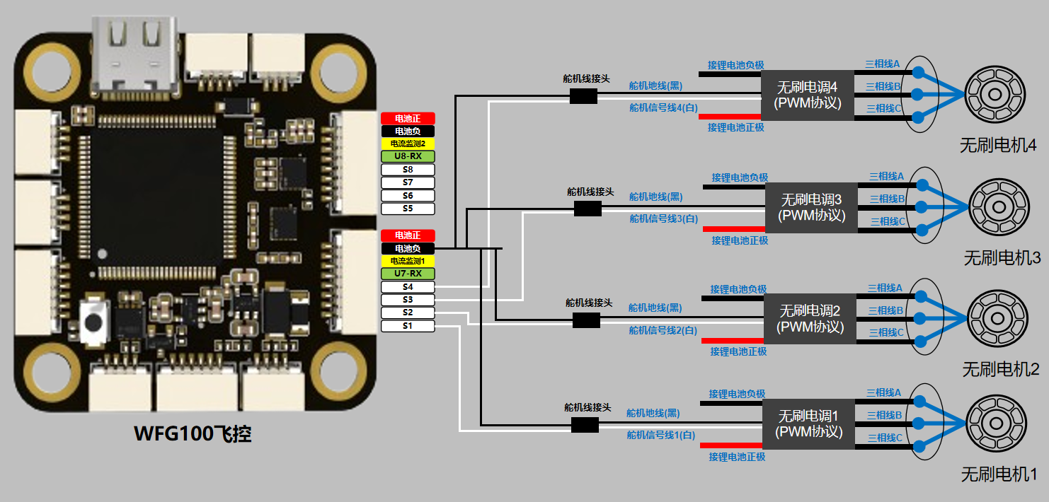 WFG100飞控的接口有S1、S2、S3、S4、S5、S6、S7、S8,共计8路电调PWM输出接口。也就说这8路PWM接口最多支持接入8个无刷电机。