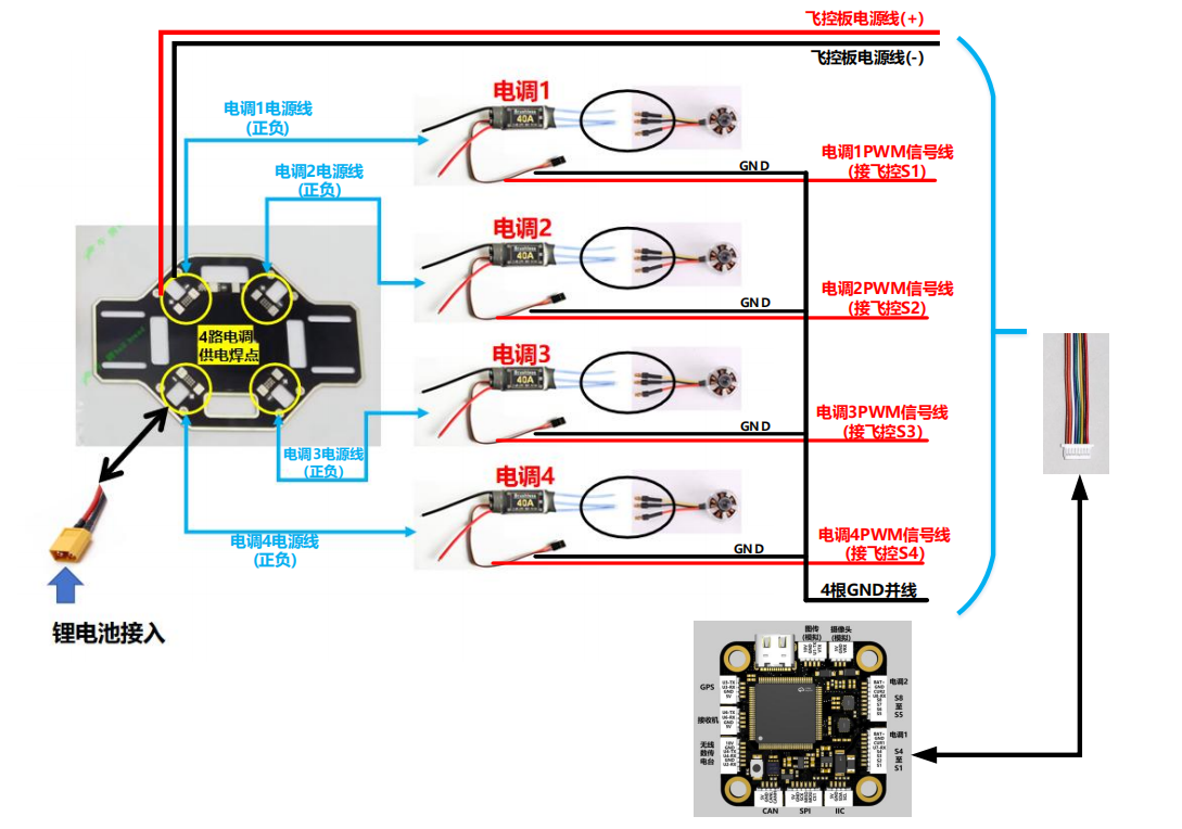 注:4个电调PWM信号线的GND可以通过电烙铁焊接汇总成1条GND线,完成共地。