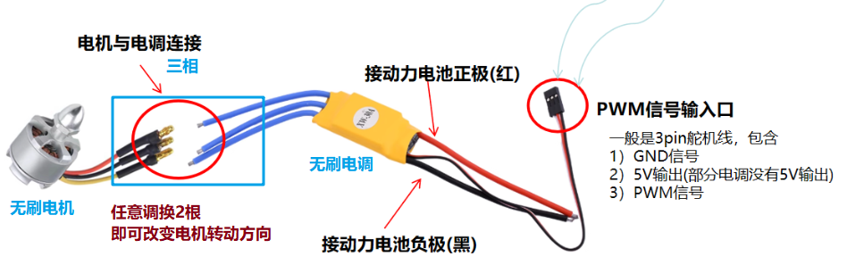 测试过程中,如果发现电机转向不对,只需要将电机与电调的3相线任意调换2相,即可改变电机转动方向。