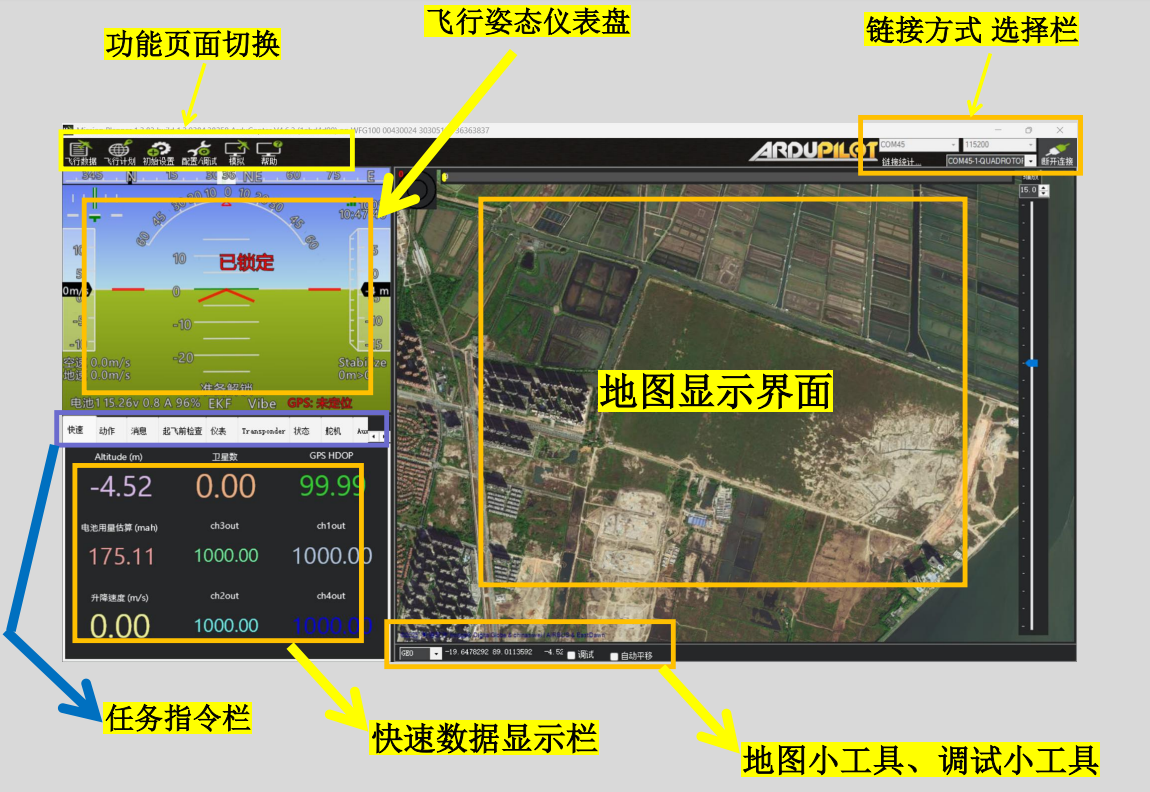 打开mp1.3.83版本,可看到上述页面。在MP地面站软件的首页中,主要分为以下几个区域,分别是: