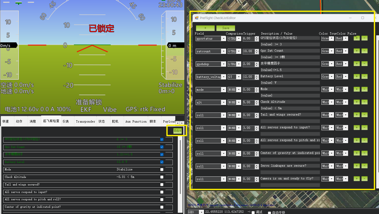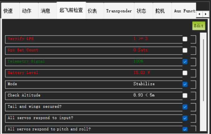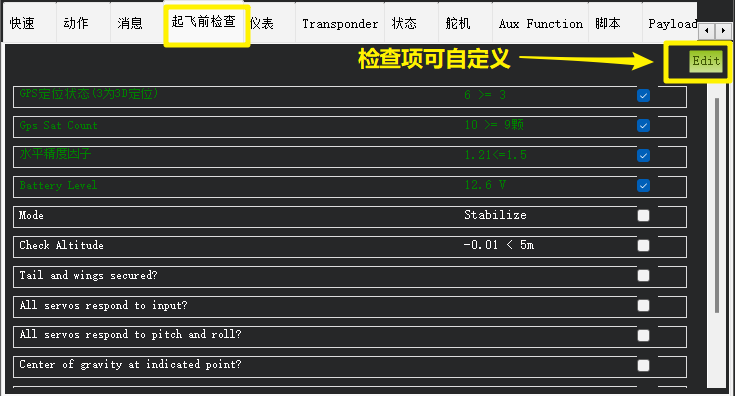 起飞前检查支持自定义检查项目(比对飞控的当前值与预设检查值),如果检查正常则会自动打上沟。