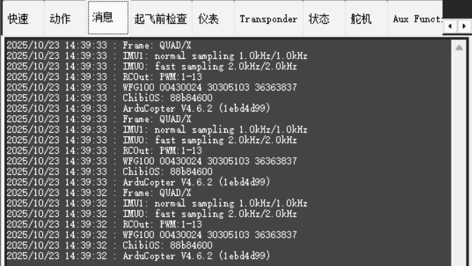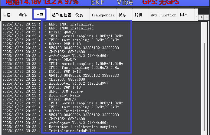 消息栏会实时显示飞控当前打印输出的一些信息(包括基础信息、警告、错误等等)