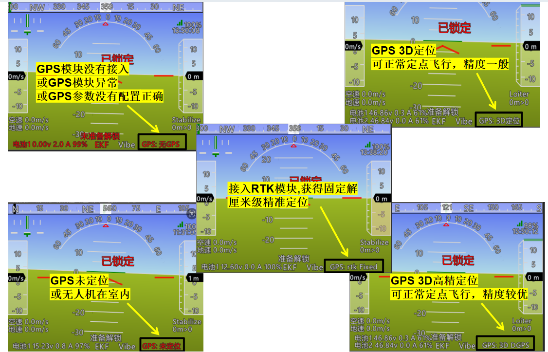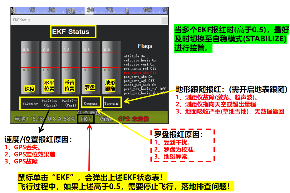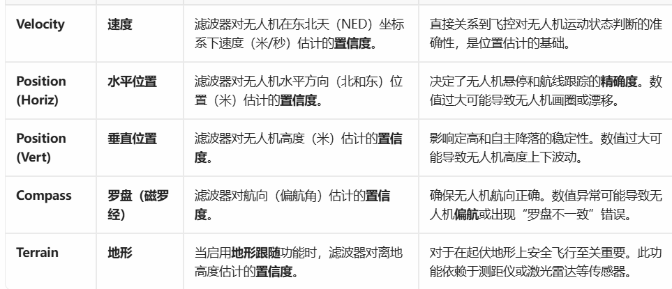 通过EFK状态来判断无人机导航系统中的速度、水平位置、垂直位置、罗盘、地形匹配数据是否健康?