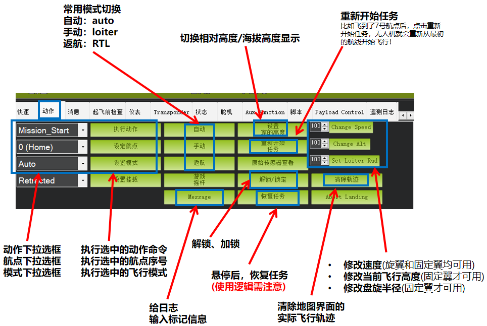 具体每个动作指令如何使用,请查看视频《MP地面站的基础使用》-视频待更新~~