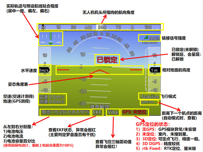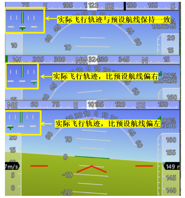 很多新手朋友不知道左上角的图标是什么意思,它是实际飞行轨迹与预设航线的偏差显示。