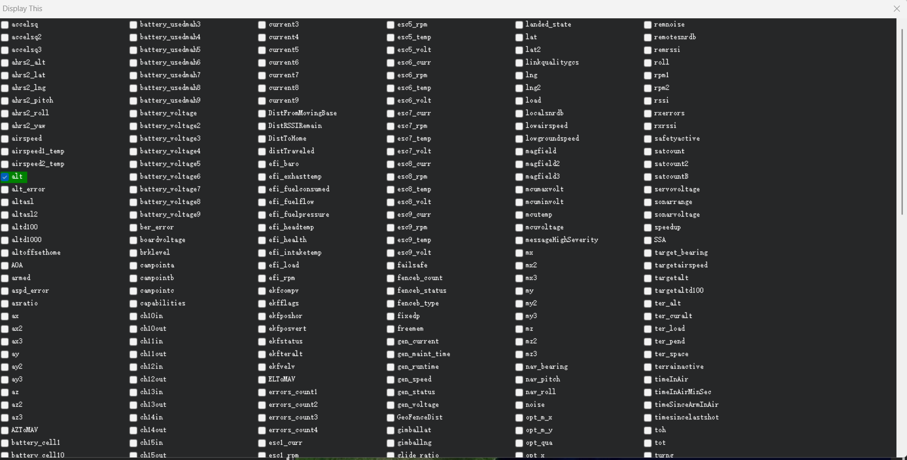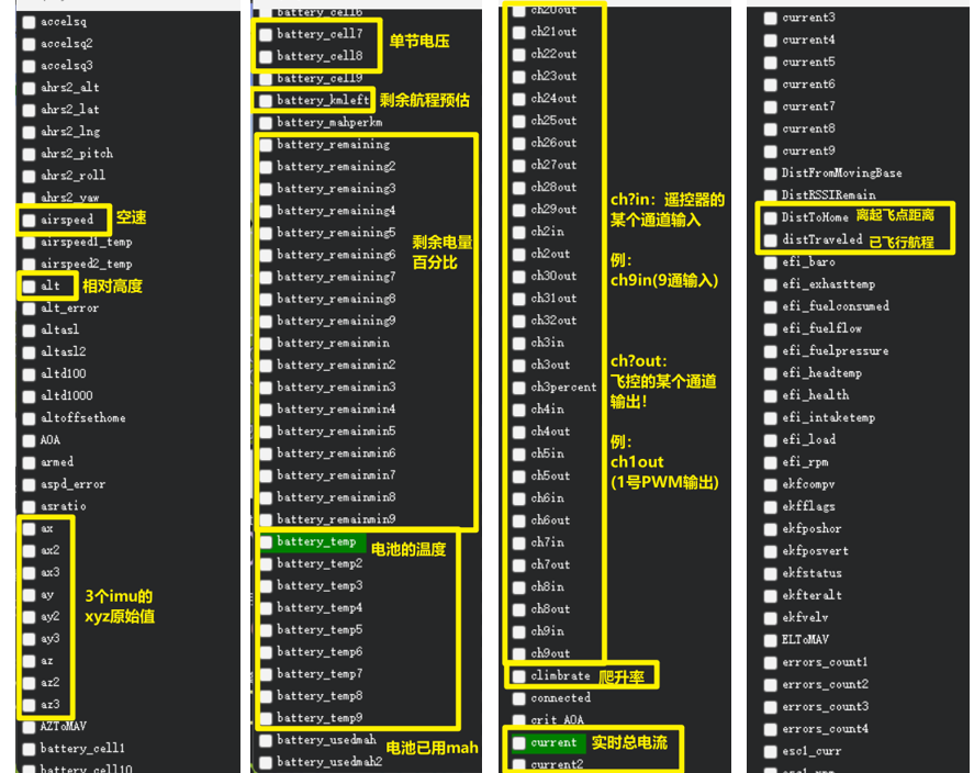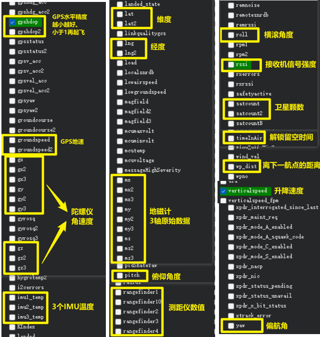 双击后,弹出以下界面,供用户自己选择要显示的 飞控数据!可以看到能够显示的数据非常多,大家也不用每一个都搞清楚是什么意思