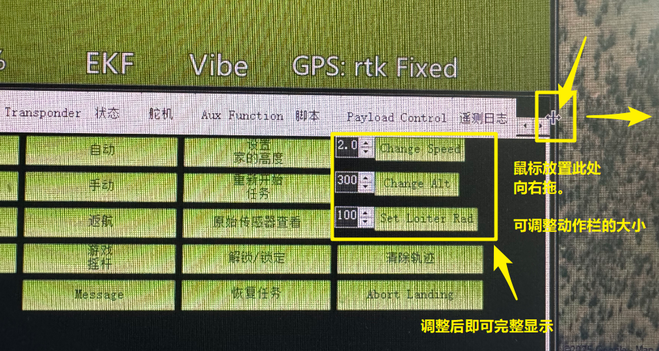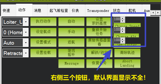 大家打开MP地面站的的“动作后”,可看到右侧有3处按钮显示不全,我们可以通过改变动作栏的大小来让其显示完整。