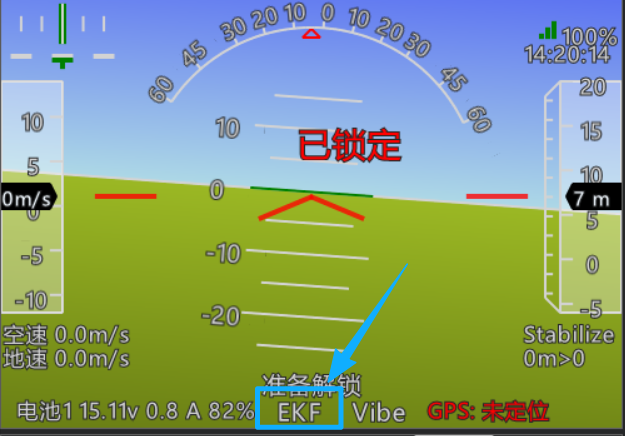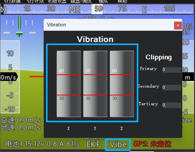 鼠标单击 HUD表中的"Vibe",可以查看飞控三轴的震动值,如果发现震动值高于警戒线30的一半,建议要对飞控做减震。