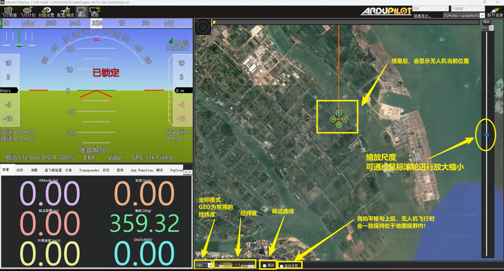 显示飞控发送的实时信息,包括Pre-Arm(解锁前自检)提示、固件版本、硬件类型等,用于故障诊断