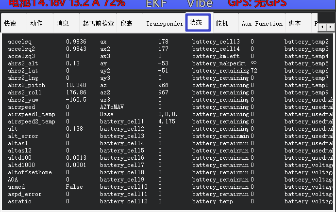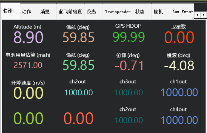 显示所有传感器数据、通道输入/输出值、飞行状态等,用于详细调试和实时监控