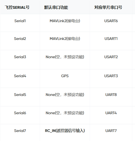 根据章节二的APM串口映射表可知,飞控源码中默认将飞控板的USART1(对应飞控Serial1)和USART6(对应飞控Serial2)设置为MAVLINK2(数传功能)。