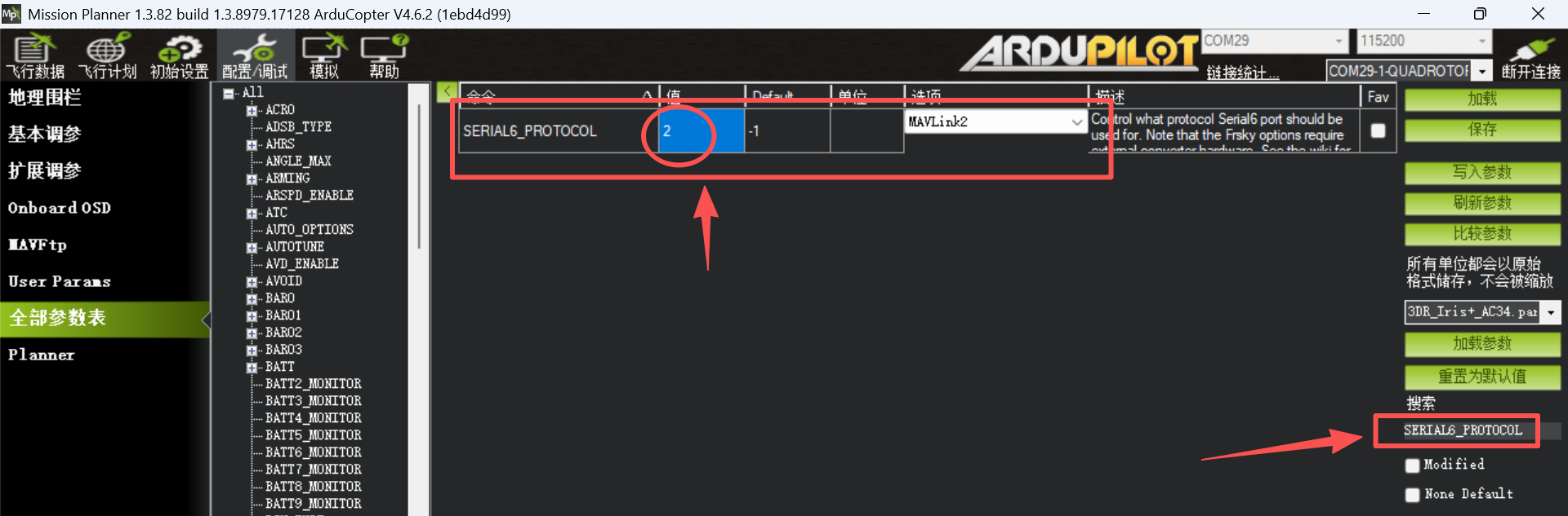 在地面站中,通过全部参数列表,搜索参数SERIAL6_PROTOCOL,并将其值=2