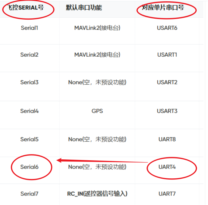 飞控硬件板的串口4,对应飞控软件上的Serial6,并且Serial6的默认串口功能是空。