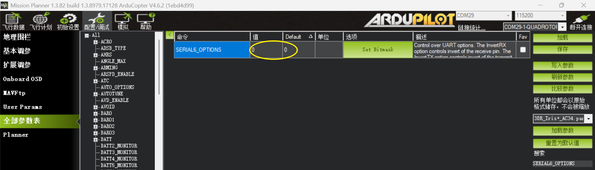 步骤3:确保SERIAL6_OPTIONS=0