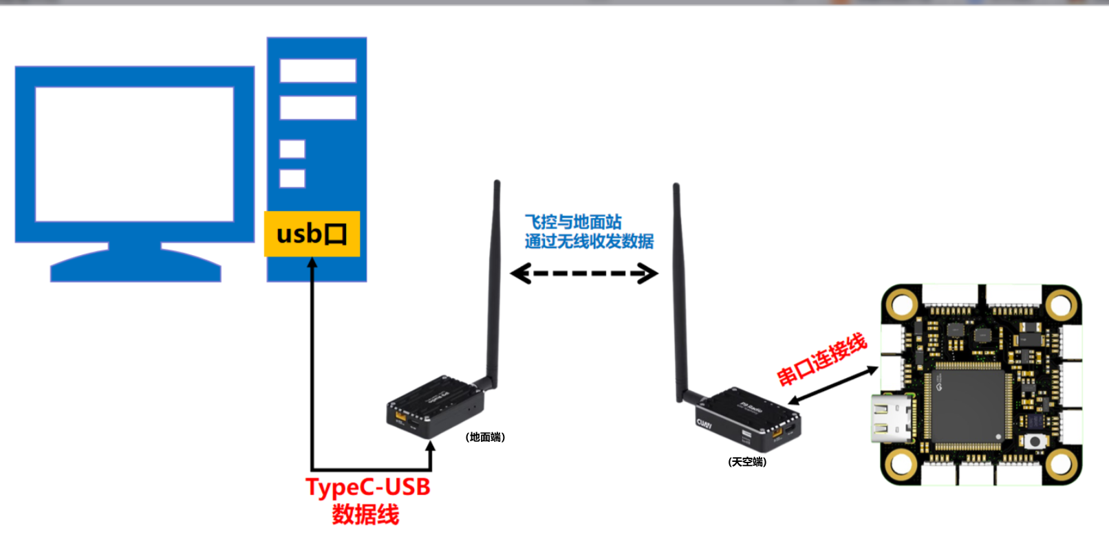 无线数传电台模块通常是串口通讯,并且是成对使用,无线数传电台天空端模块与飞控的串口相连,无线数传电台天空端模块与PC电脑的USB口相连。