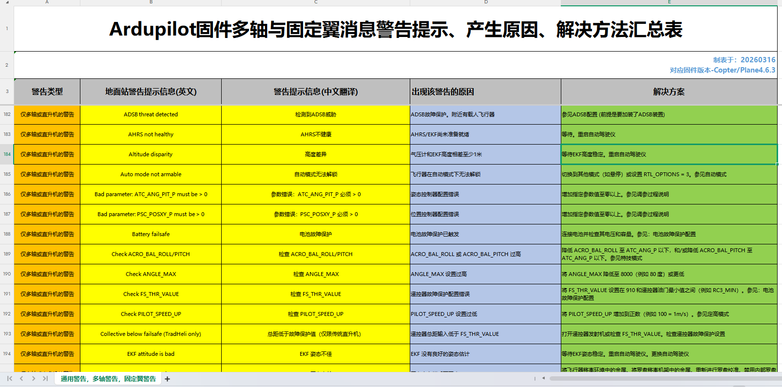 Ardupilot固件多轴与固定翼消息警告提示、产生原因、解决方法汇总表V1.1-20260316.xlsx (35.26 KB)