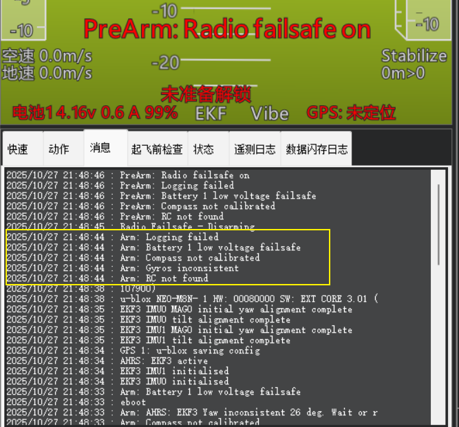 遇到无法解锁的情况时,请不用紧张,打开MP地面站的消息提示栏,根据提示消息锁定解锁失败的原因。