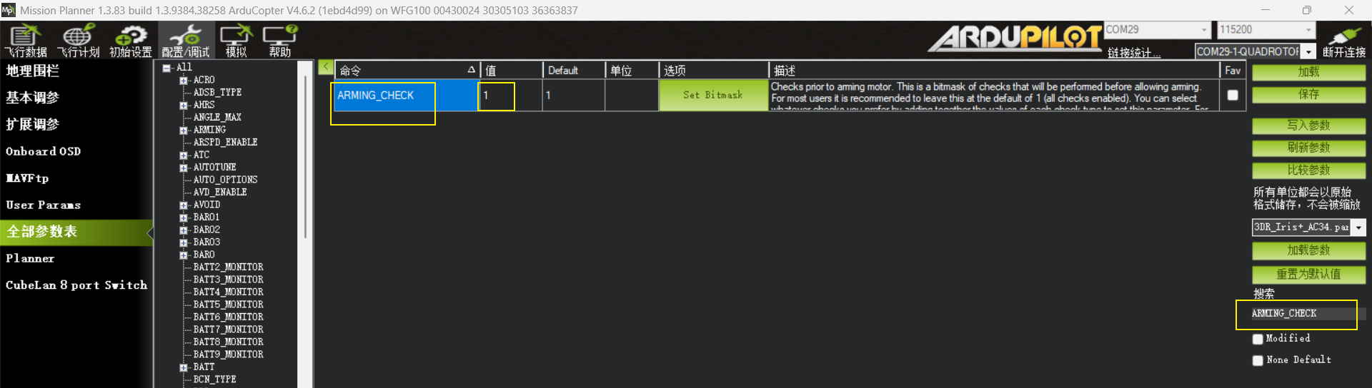 当然这解锁检查机制也不是百分百可靠的,你可以通过在全部参数列表Arming-check 禁用它。