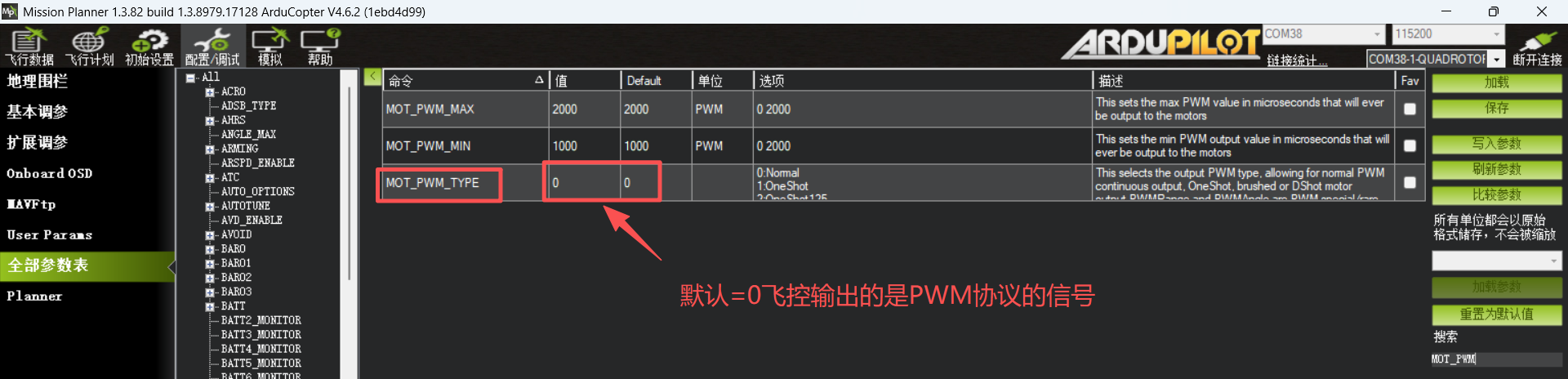 参数MOT_PWM =6(代表Dshot600).