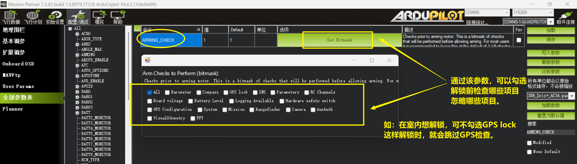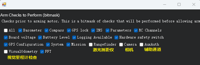注:ARMING_CHECK这个参数为设置解锁时的检查项,如果某项传感器在解锁时状态检查不通过,则不给用户解锁。