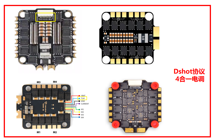 2)4合一的穿越机电调,其外观如下图所示,飞控需要输出Dshot协议,电机才能正常转动。