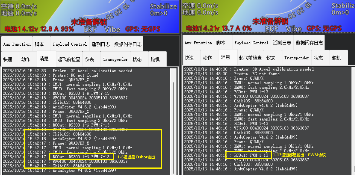 通常在地面站的"消息栏"中,如果的使用的是Dshot协议的电调,无人机上电会打印飞控的输出的PWM协议,那么电机肯定就无法正常响应。