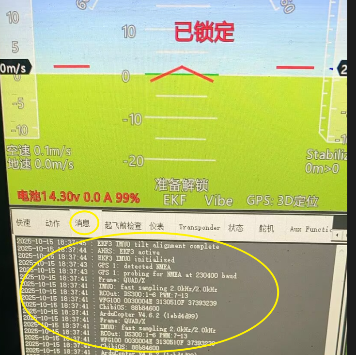 此时用户可使用USB线或无线数传电台连接MP地面站,查看地面站的"消息栏",飞控在上电瞬间会显示基础信息,如下图所示分别是: