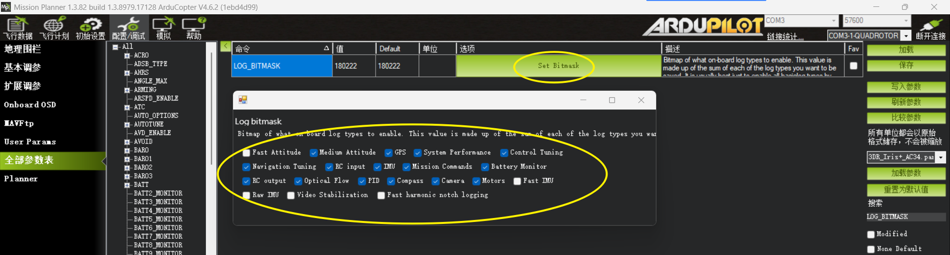 参数LOG_BITMASK (选择需要记录的数据类型,默认即可;用户可按需调节,如果不需要记录某项参数,不勾选即不记录!)