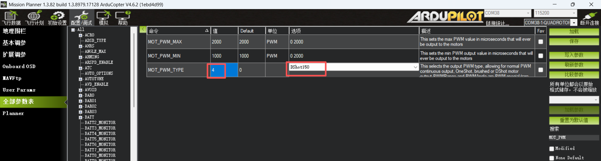 参数MOT_PWM =4(代表Dshot150).
