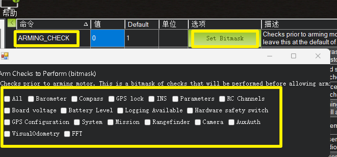 如果我们想要在室内进行解锁调试,那么就可以将ARMING_CHECK = 0, 这样无人机就可以忽略所有检查项目,在室内进行解锁。