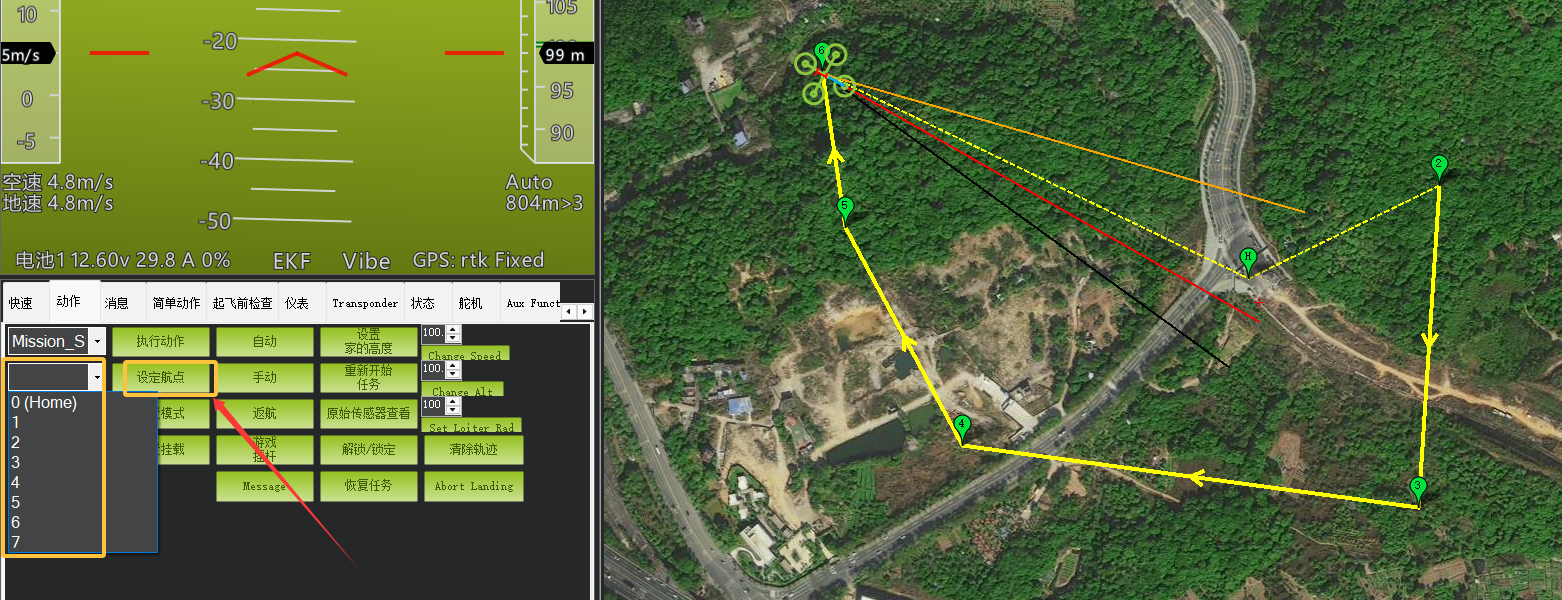 2)用户也可以通过地面站“动作”->“返航按钮”,点击一下即可返航!