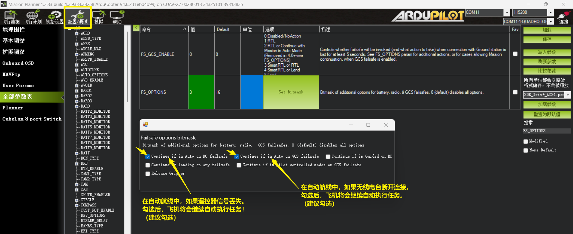 如果在执行任务过程中,希望信号丢失以后,无人机不返航,而是继续执行动作,那么我们要将参数FS_OPTIONS=3。