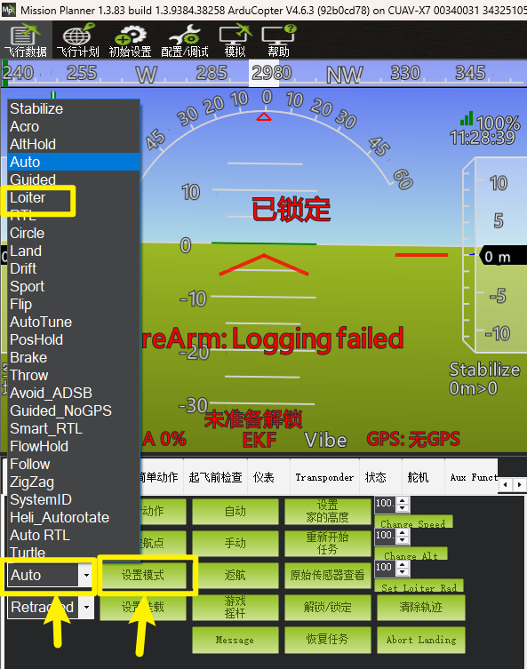 3)、可以通过地面站的"设置模式下拉窗口"->“设置模式”,切换至“Loiter模式”