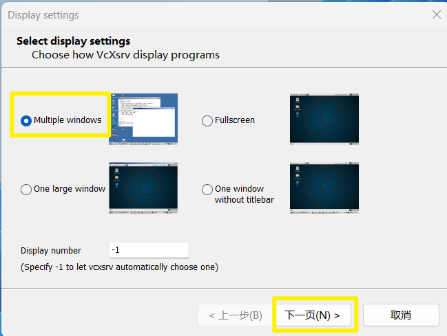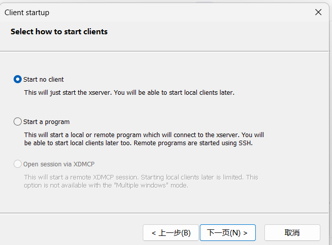 启动 VcXsrv,选择 “Multiple windows” 或 “One large window”,