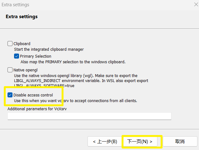 安装时按默认选项即可,注意勾选 “Disable access control”(否则 WSL 可能无权连接)。