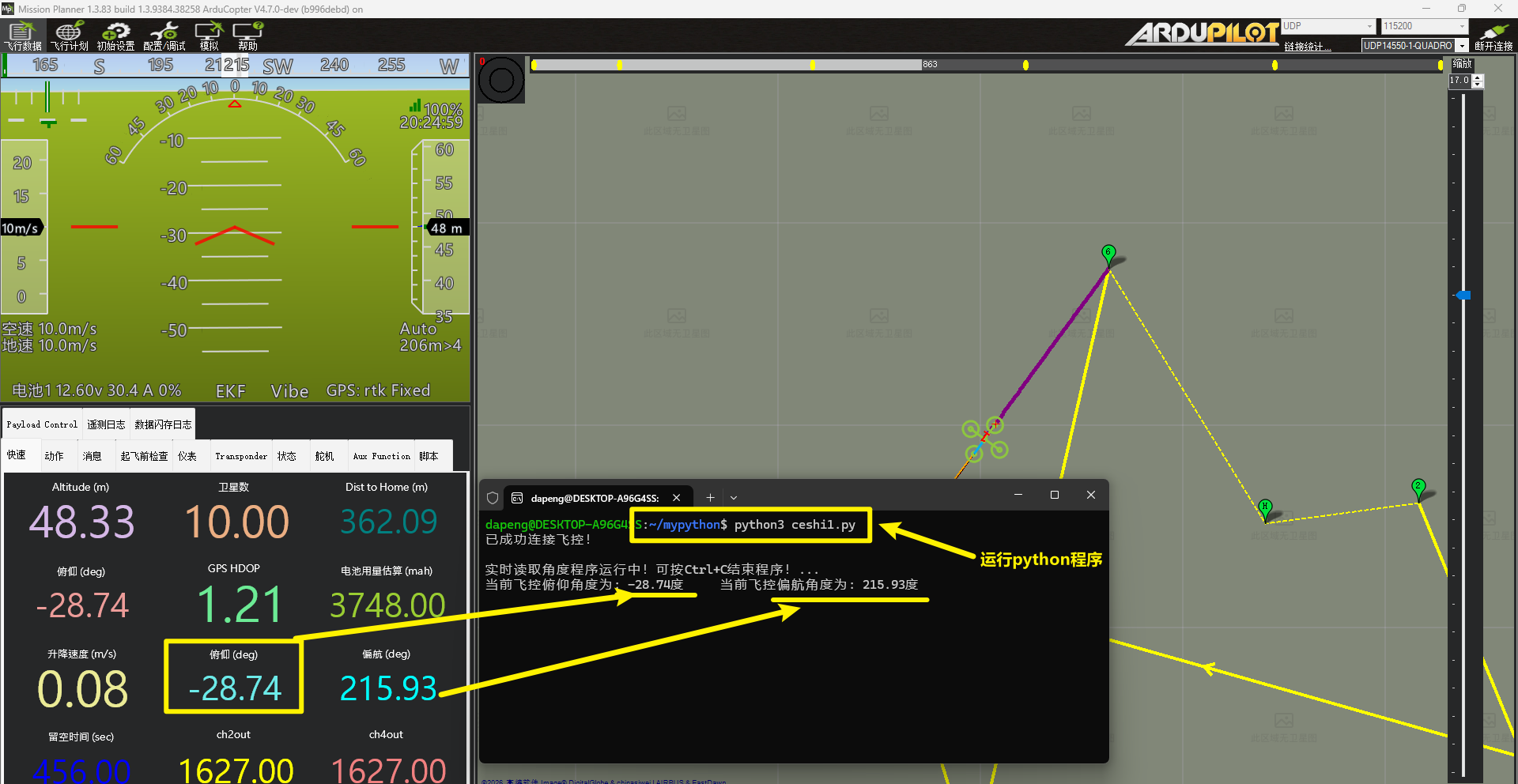 最终我们就可以实现MP地面站连接着仿真飞控固件,python脚本也能连接到仿真飞控的固件。