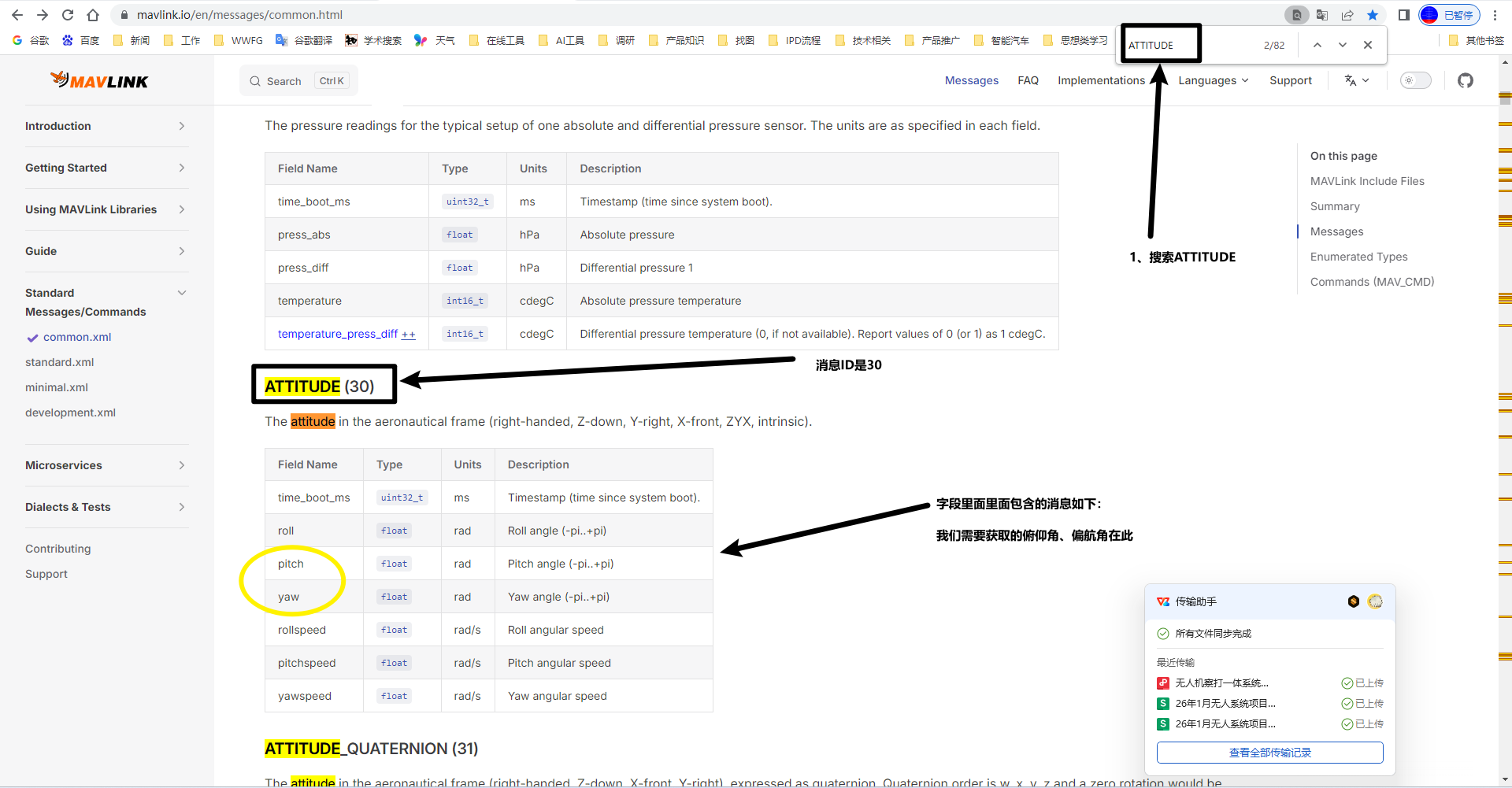 我们可以查询mavlink官网的通用消息字段表(https://mavlink.io/en/messages/common.html),对ATTITUDE这个字段进行查看,看看里面都包含了什么?