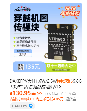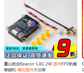 2 | 模拟图传天空端 4.9Ghz~5.8Ghz | 注意:模拟图传当前一般是500mw\1W\1.6W\2W功率,功率越高传输信号越强。 但是部分对电磁信号敏感的人,使用2W功率的图传会感到恶心!(辐射过大) 模拟图传天空端也是,大家可以在淘宝进行搜索,价格有100-150左右!在淘宝搜索 “模拟图传”
