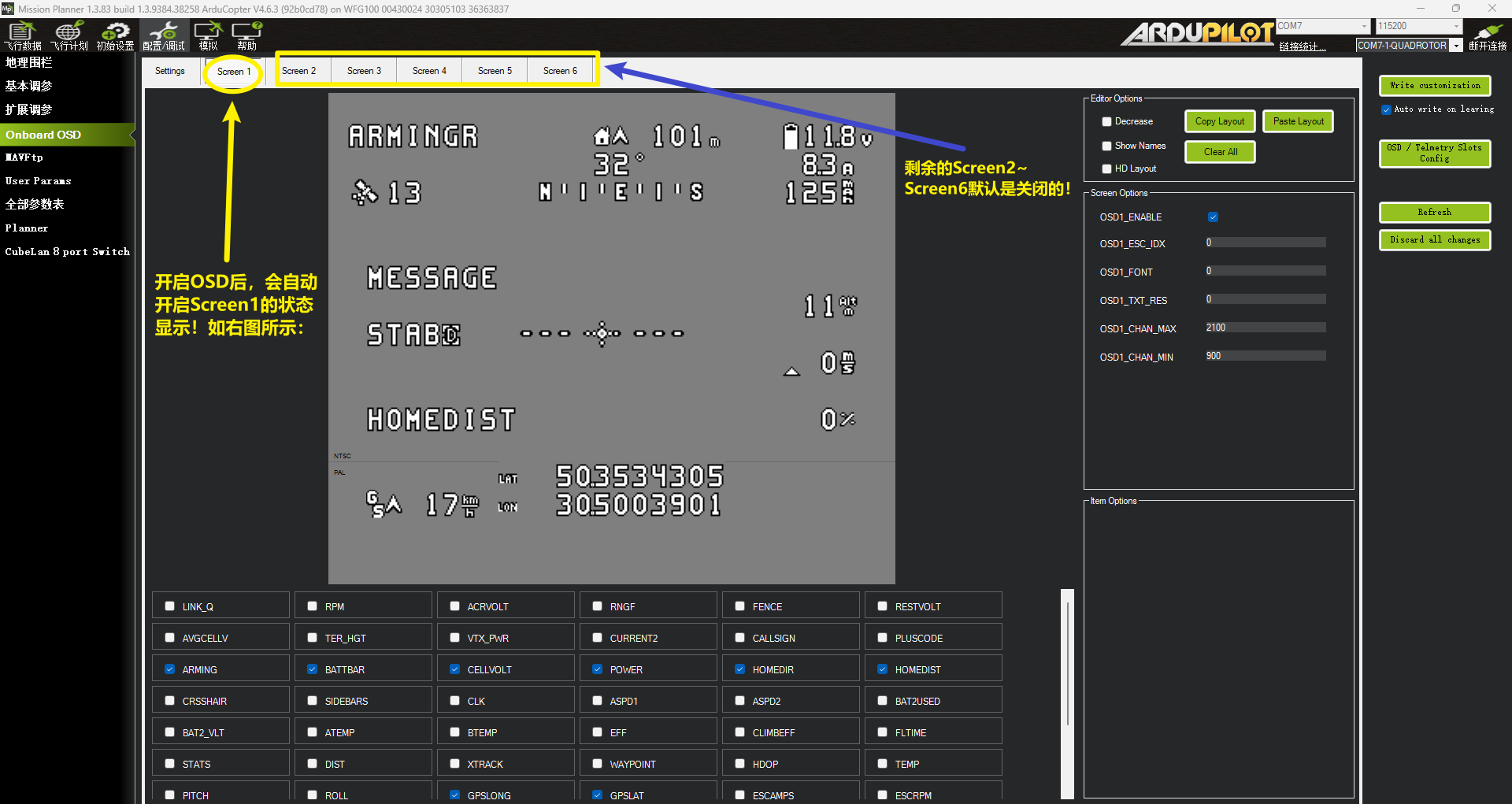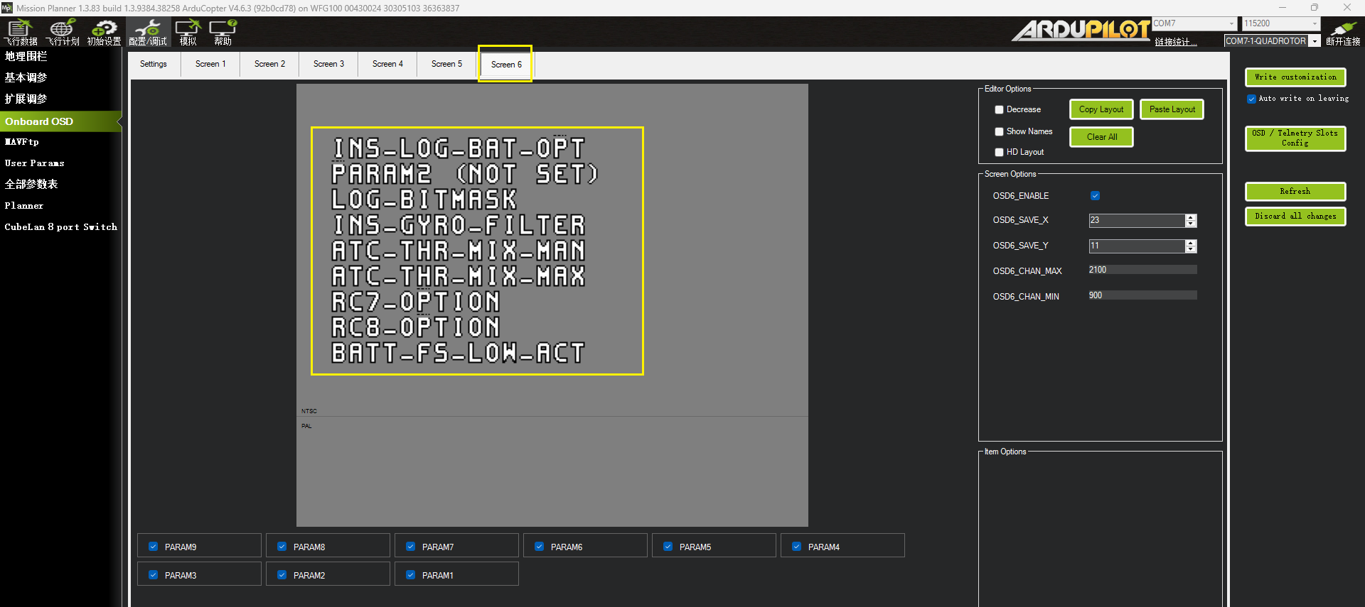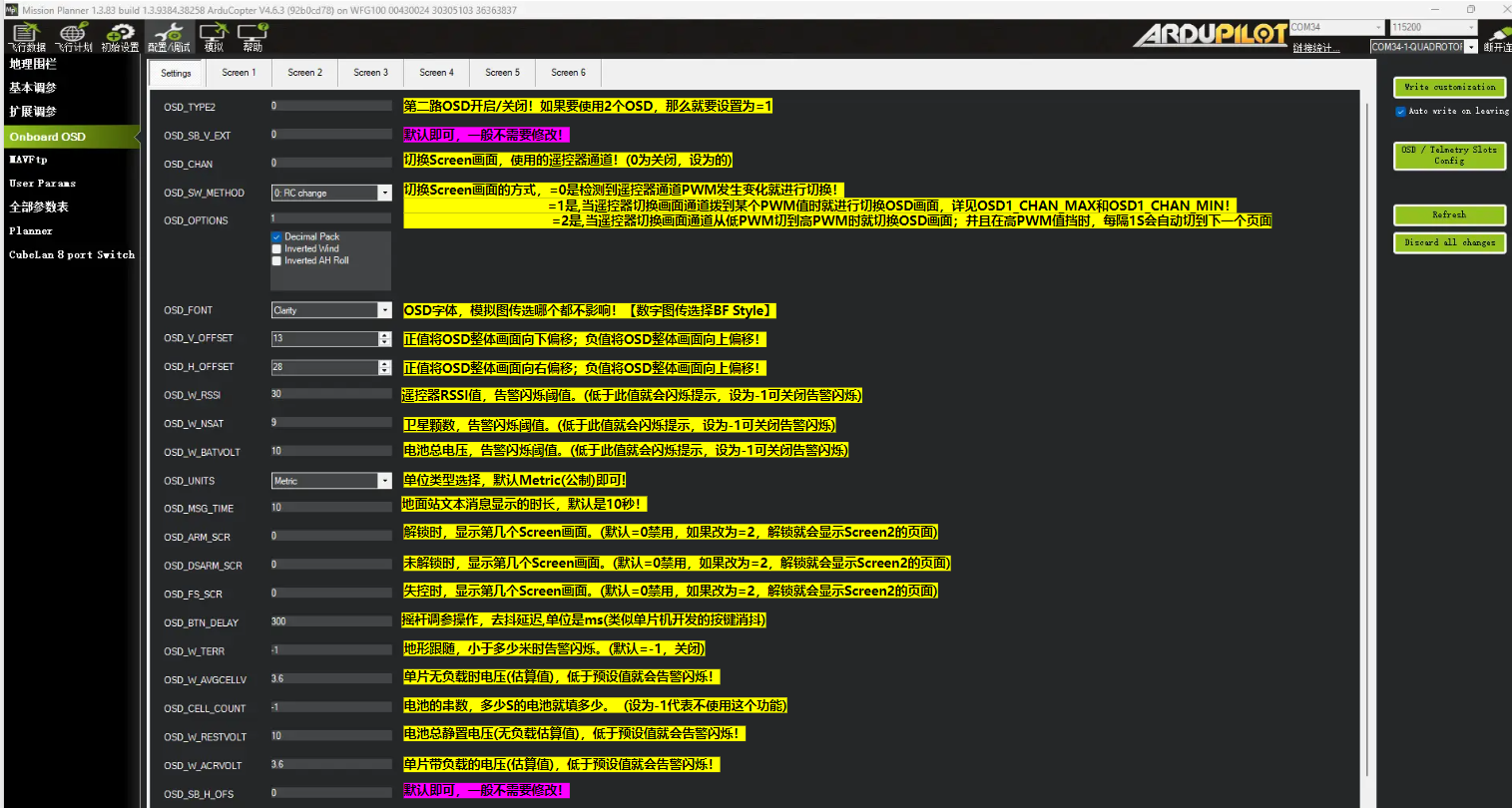 在将参数OSD_TYPE =1后,便可在配置/调试->Onboard OSD界面中看到OSD的设置页、6个Screen页面!