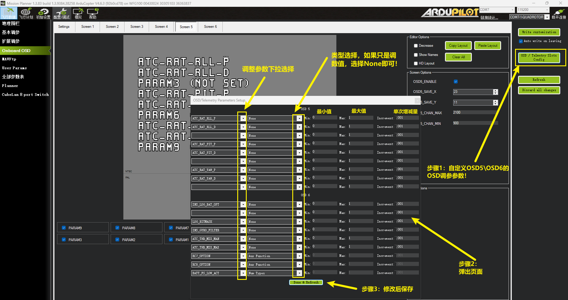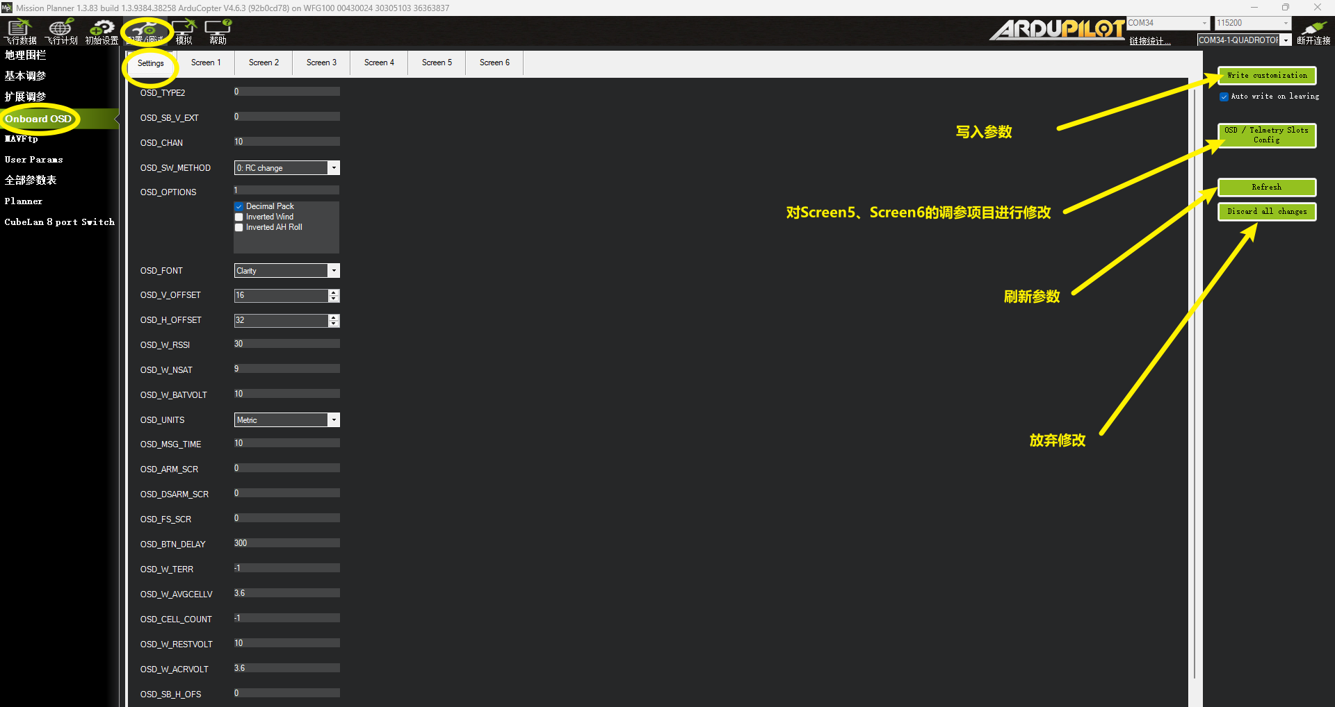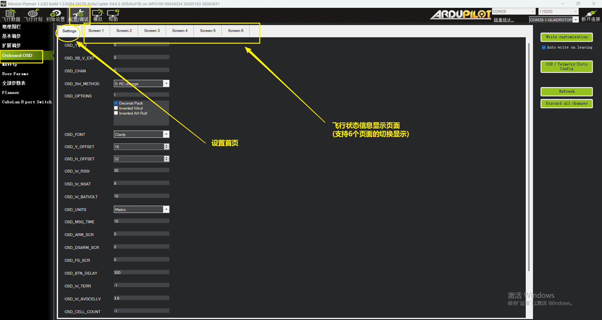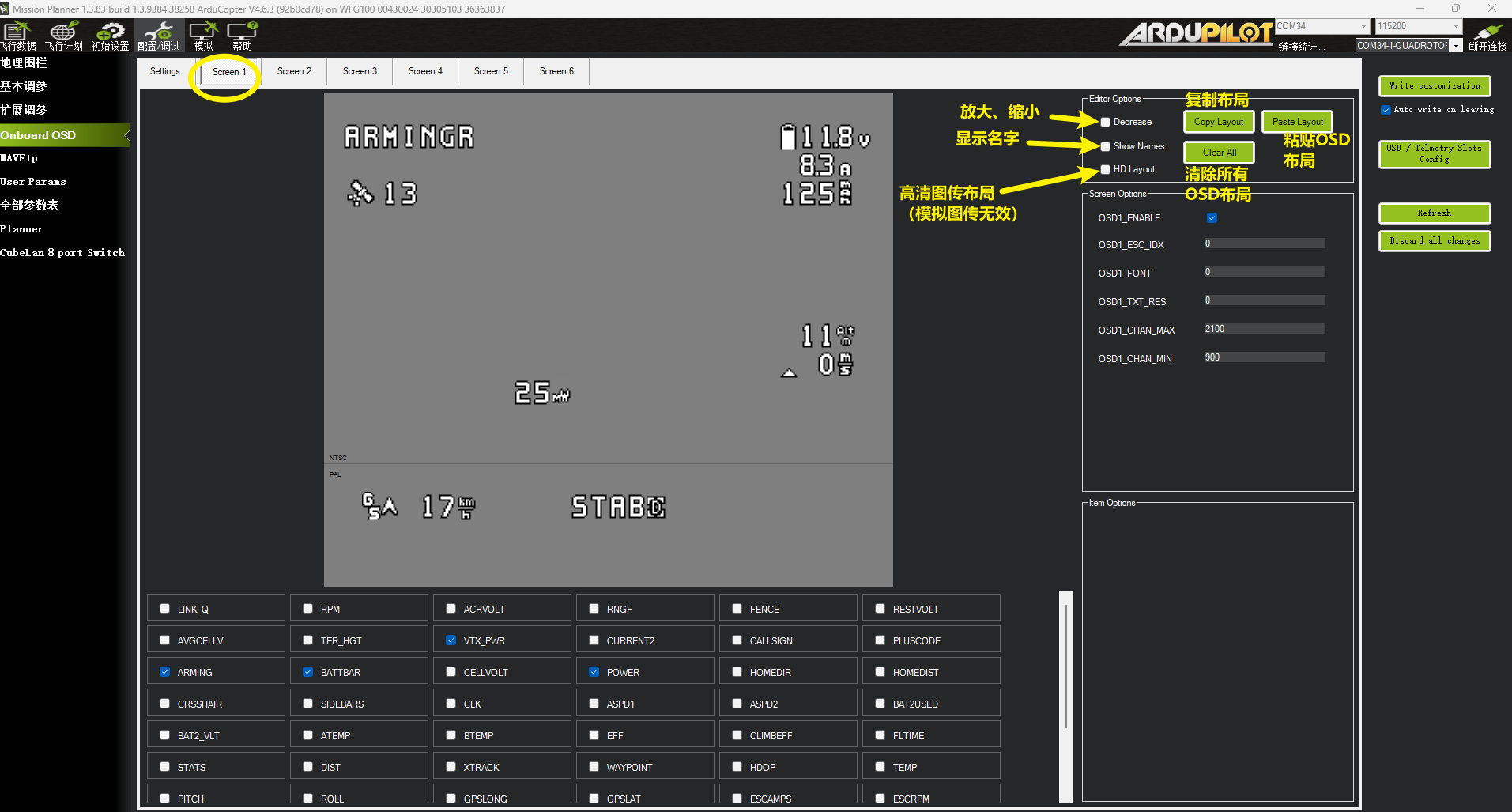 在将参数OSD_TYPE =1后,便可在配置/调试->Onboard OSD界面中看到OSD的设置页、6个Screen页面!
