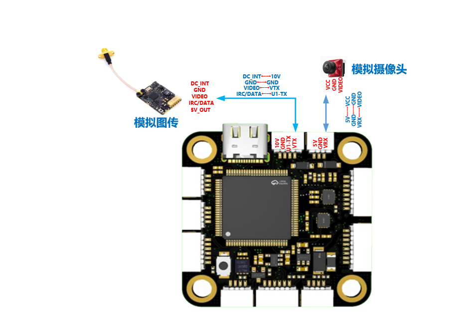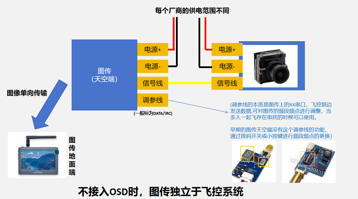 模拟图传与模拟摄像头,是独立于飞控系统工作的。图传与摄像头之间不需要与飞控或OSD芯片有任何连接,其拓扑图如下: