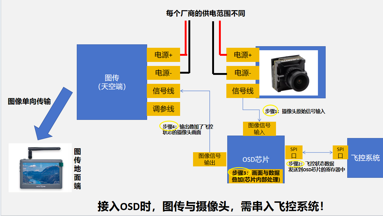 模拟图传与模拟摄像头需要通过OSD芯片作为中转桥梁(同时连接飞控、摄像头、图传天空端)!