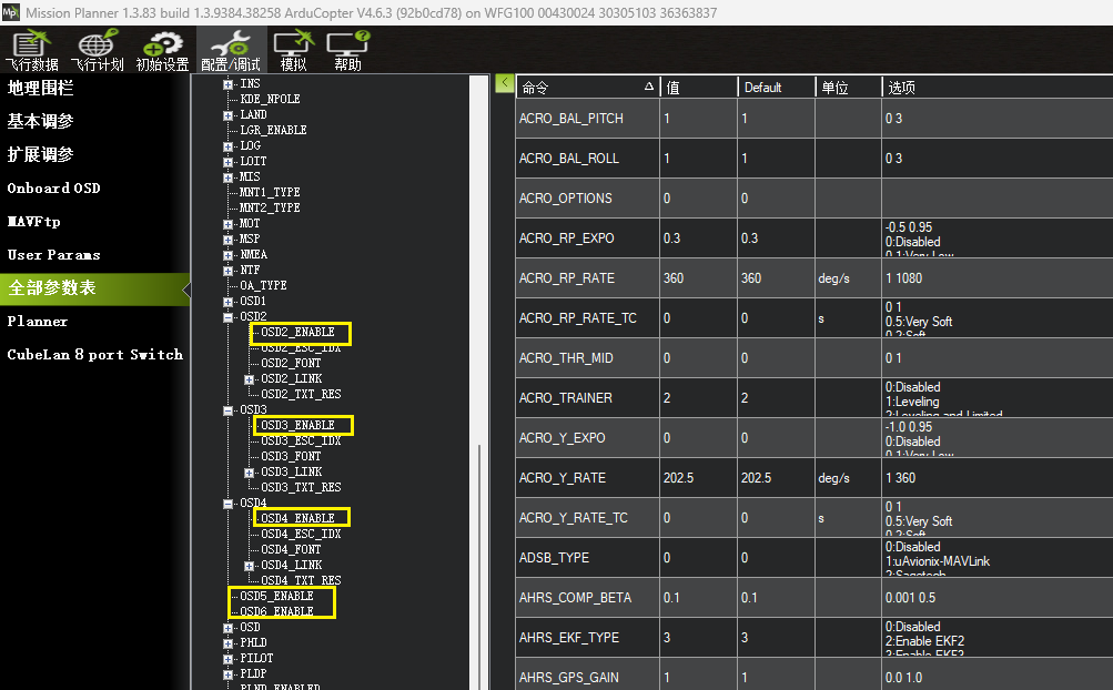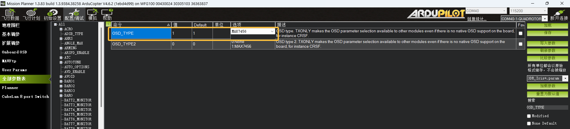 设为1,代表开启模拟图传OSD(MAX7456E)