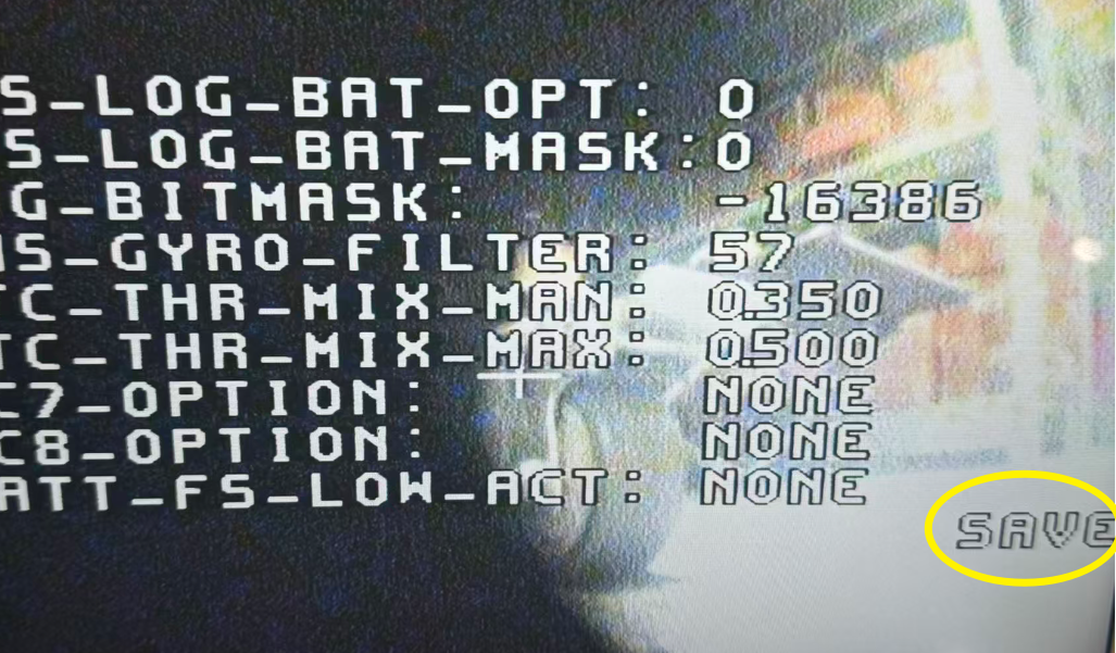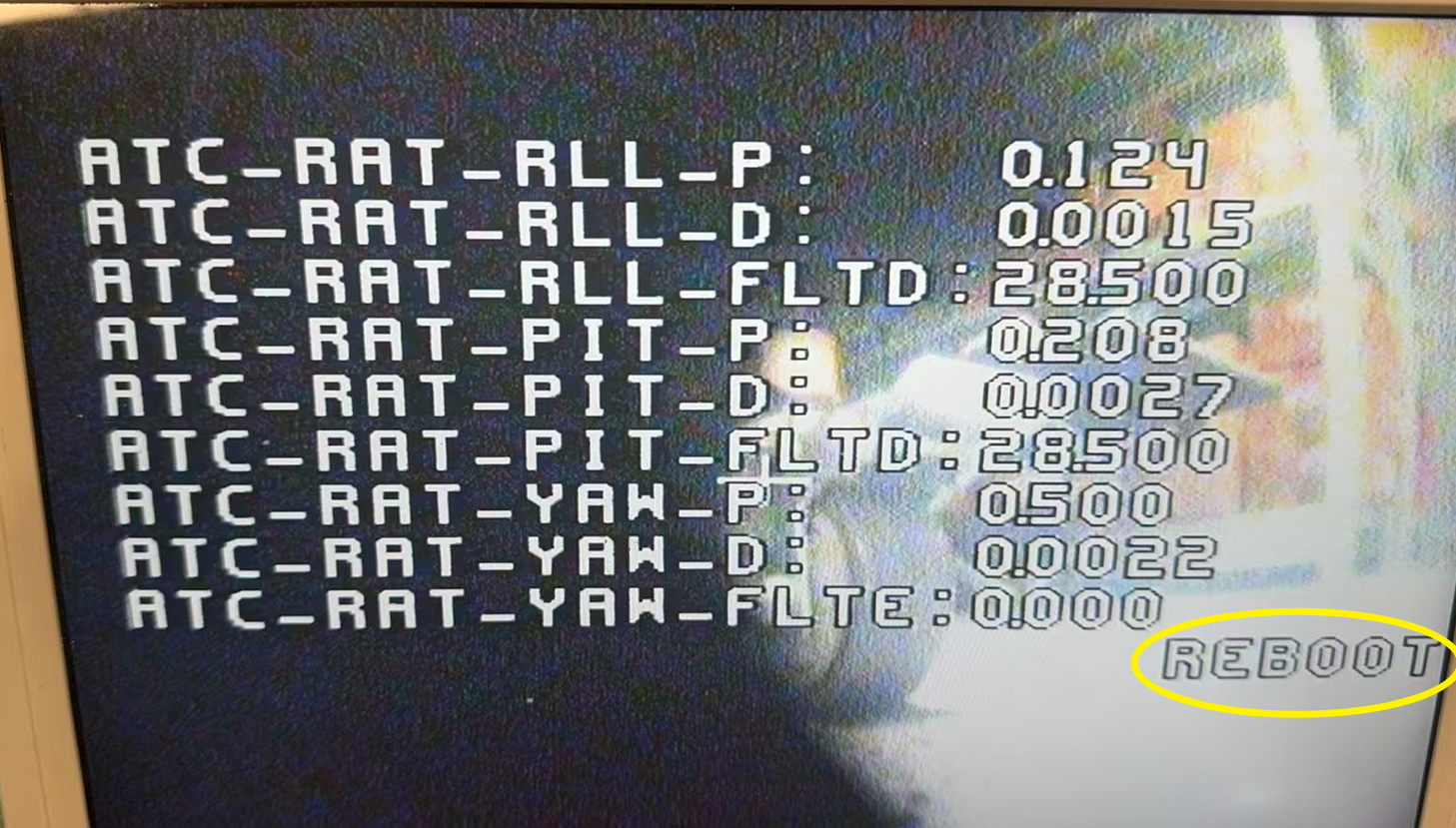 修改完毕后,通过遥杆控至"SAVE",打1下右横滚即可保存;随后“SAVE”会变为“REBOOT”,再打右横滚保持3s即可重启飞控!