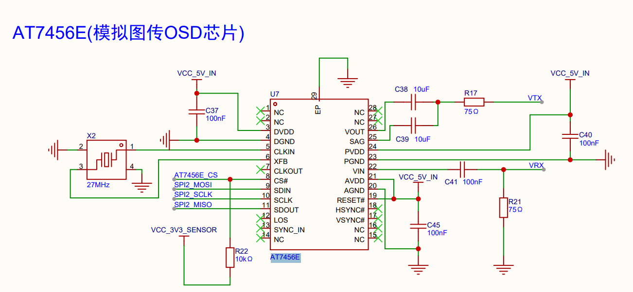 WFG100飞控上已板载了OSD芯片,就是原理图上的AT7456E芯片,如下: