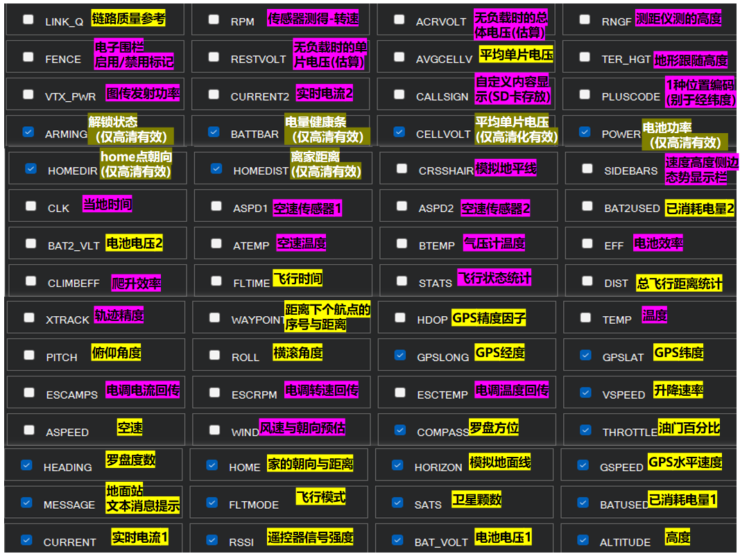 AP固件支持使用OSD进行参数调整,比如在没有携带地面站的情况下,修改返航高度、修改PID等等。