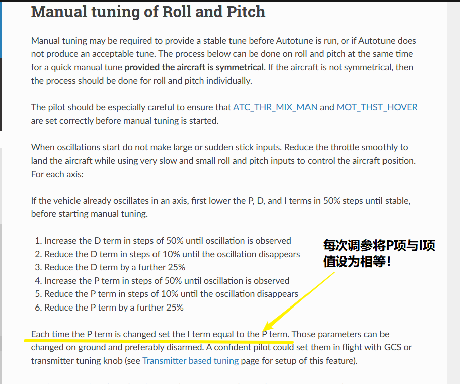 此外通过APM的官方wiki文档,在调参一文中,也是让用户把P值与I值设置为一样,如下所示: