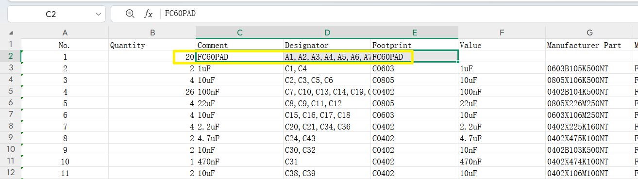 导出的BOM表中,会有20个 “FC60PAD”,这个不是物料器件,是我们手动添加上去的焊盘。