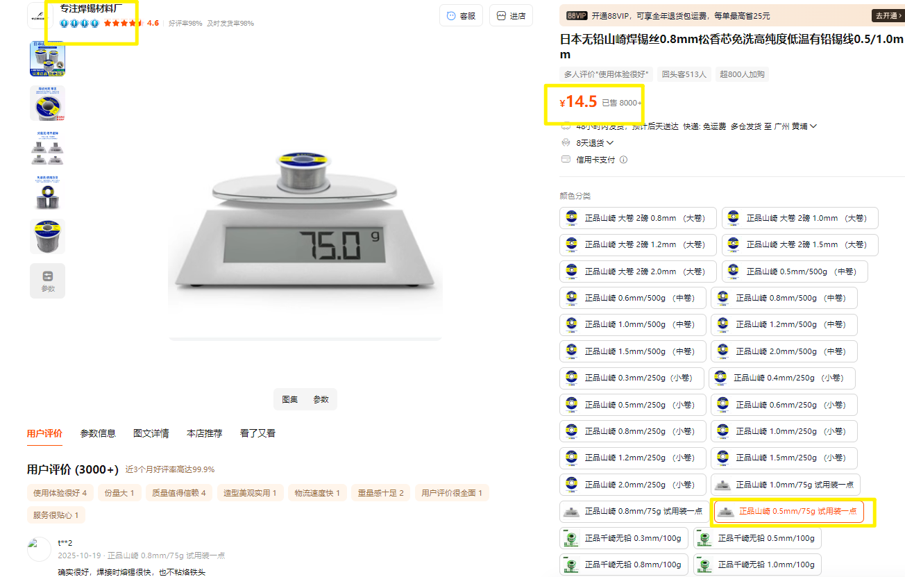 焊锡丝本人采用的是山崎的0.5mm的焊锡,只是焊接飞控的话,买个75g就够了(14.5大洋)