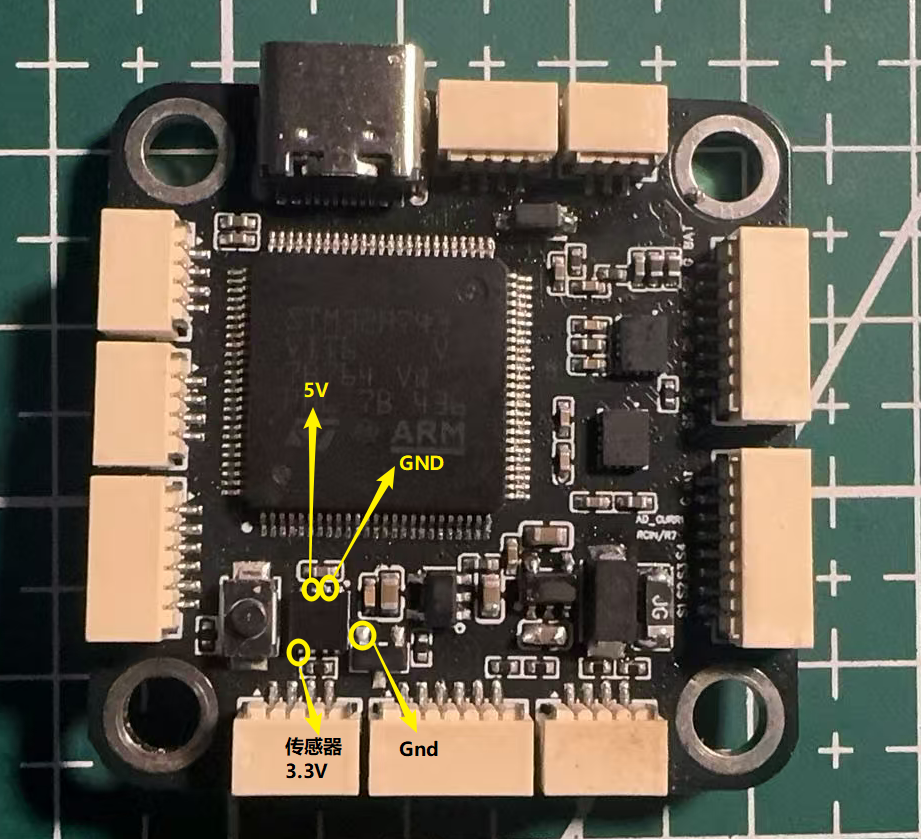 使用USB线拆入飞控的TypeC端子,给飞控供电上电!(首次上电最好用一个5V电源适配器进行供电,避免极端情况烧坏电脑USB口)